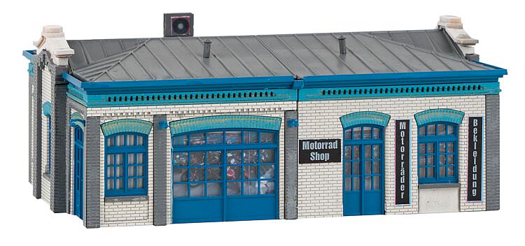 Sklep motocyklowy w parterowym budynku z cegły z efektowną niebieską bramą, drzwiami, oknami, segmentowymi łukami i fryzami.