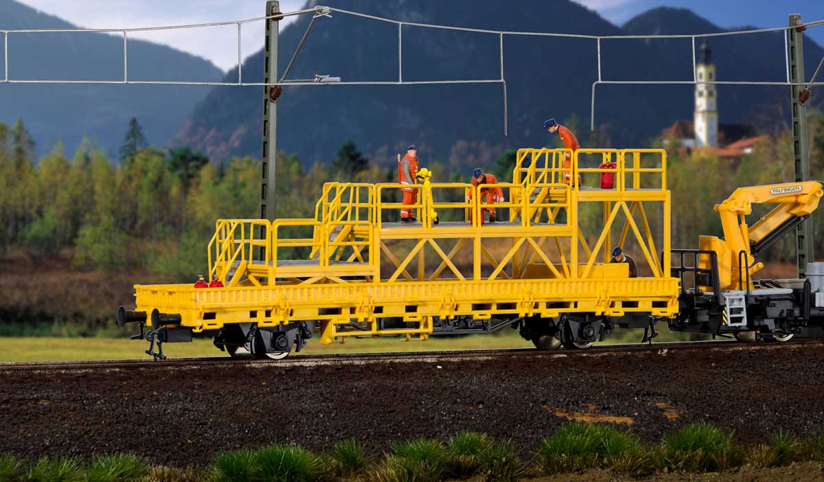 Model z serii GleisBau z pomostami budowlanymi do usuwania usterek w sieci trakcyjnej.