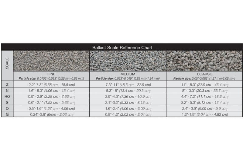 W galerii przedstawiono tabelę zawierającą porównanie wielkości (gradacji) ziaren szutru do danej skali modelarskiej