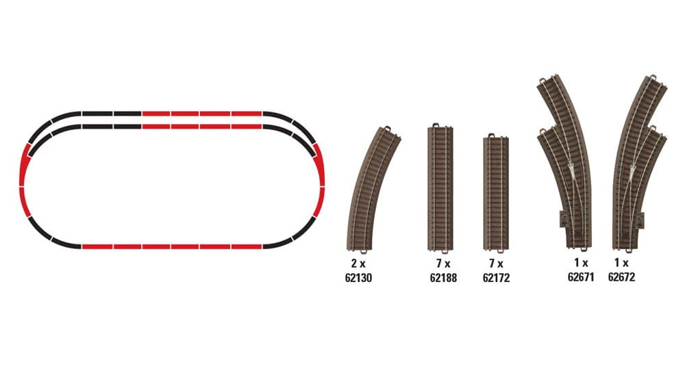 Zestaw pomocniczy pozwala rozszerzyć układ torów dostępny w zestawach startowych· Odpowiedni do połączeń równoległych, węzłów, wiaduktów, rozjazdów, torów bocznych i nowych odcinków. Pasuje do zestawów startowych firmy Trix oraz do istniejących układów torowych - w opakowaniu elementy widoczne na schemacie w kolorze czerwonym.